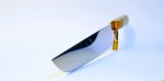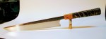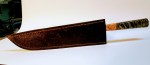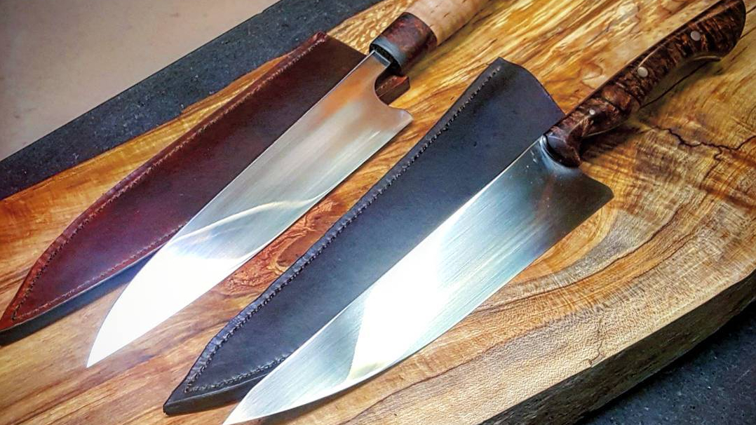 Detroit Gyuto ‘Sujihiki‘ – The Japanese Sujihiki is a slicer/Gyuto with Box Elder and woolly mammoth (~10K yrs old) handle. Comes with handmade leather Saya. AEB-L steel, Rockwelled @61. Price: $650