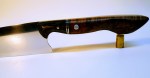 Detroit 7″ Chef – Western Chef with Black Palm and Black Ash Burl. Stainless pins and Nickel liners. Comes with handmade leather Saya. 154CM steel, Rockwelled @61. Price: $375