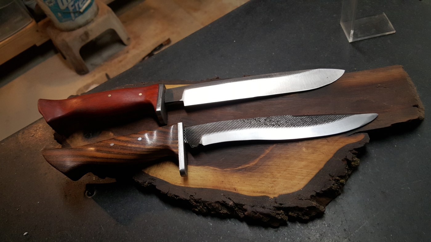 Knives made from vintage Nicholson metal files. The first is a Recurve design with Zebra Wood handle. The second is in Padauk. Both come with custom handmade leather sheath. Price: $145 (Recurve in Zebra has been SOLD)